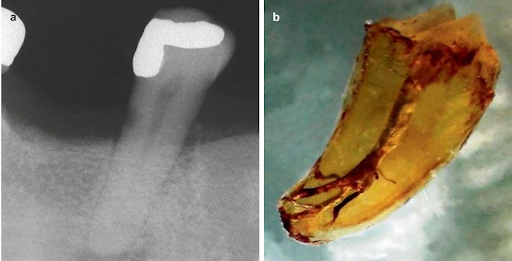 (a) Phim cận chóp răng cối nhỏ thứ hai hàm dưới trước khi nhổ. (b) Hình ảnh răng sau khi làm trong suốt. Giải phẫu phức tạp vùng quanh chóp được quan sát một cách rõ ràng.
