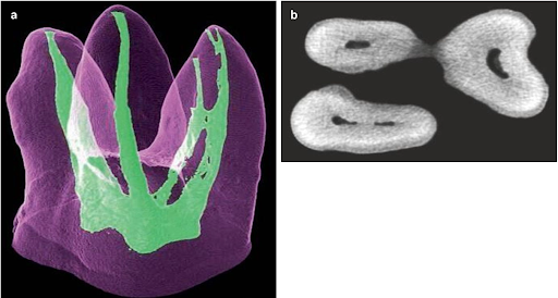 (a) Hình ảnh tái tạo micro – CT răng cối lớn thứ nhất hàm trên. Hệ thống ống tủy của chân gần ngoài (MB) hiện diện dưới dạng một hệ thống phức tạp 2-1-2-2. (b) Hình ảnh micro – CT cắt theo mặt phẳng axial của răng cối lớn thứ nhất hàm trên, ở đoạn giữa chân răng. Hệ thống ống tủy MB ở mức này dường như có 2 ống tủy.