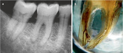 (a) Phim cận chóp răng cối lớn thứ nhất hàm dưới trước khi nhổ. (b) Hình ảnh răng sau khi được làm trong suốt. Giải phẫu phức tạp được quan sát một cách rõ ràng.