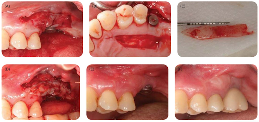 Phẫu thuật ngách hành lang và phẫu thuật cắt thắng kết hợp ghép nướu tại răng #25 và implant #26. (A) Lật vạt bản phần tại đường nối niêm mạc-nướu. (B) Mảnh ghép nướu được thu hoạch từ khẩu cái bên trái. (C) Mảnh ghép nướu có kích thước khoảng 25 mm x 7 mm. (D) Mảnh ghép nướu được khâu vào vị trí nhận ghép bằng mũi khâu rời đơn đi qua miếng ghép và màng xương. (E) Ba tuần sau phẫu thuật cho thấy sự lành thương bình thường. (F) Ngách hành lang đã được làm sâu và không còn thắng bám sau 4 tháng theo dõi. Đủ dải nướu sừng hóa ở mặt ngoài implant #26.