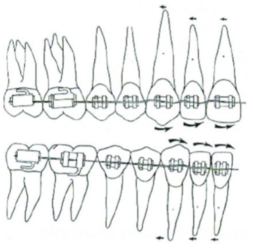 Đó là sự di chuyển răng cần thiết để có thể đẩy được dây thép chữ nhật kích thước 0.19/0.25 vào trong khe mắc cài và đạt được dạng cung phù hợp với hệ thống mắc cài 0.22 điều chỉnh sẵn được đặt chính xác.