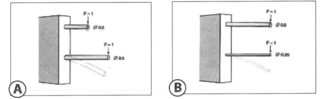 (A) Chiều dài tăng gấp đôi, dây có biên độ hoạt động tăng lên 8 lần; (B) Đường kính dây giảm %, biên độ hoạt động tăng lên 16 lần.