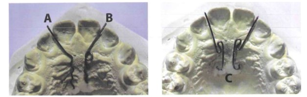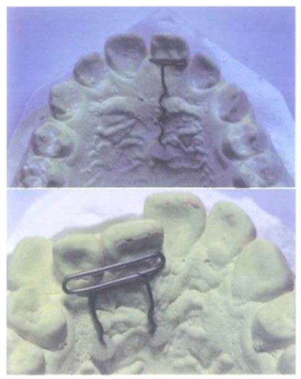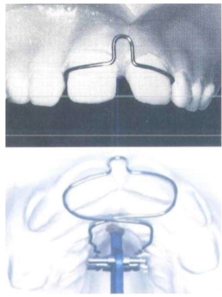 Lò xo đóng khe hở răng cửa: Khi tăng lực cung hình U ở mặt má sẽ tạo lực di gần để đóng khe. Phía lưỡi, chân lò xo đan chéo nhau, kết hợp với ốc nới rộng chiều ngang sẽ tạo thêm lực đóng khe răng ở mặt trong khi vặn ốc nới rộng (Hình 6).