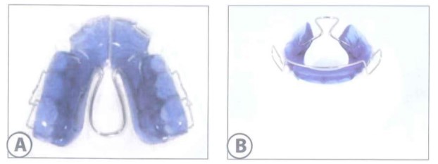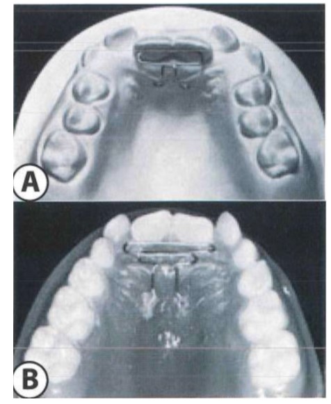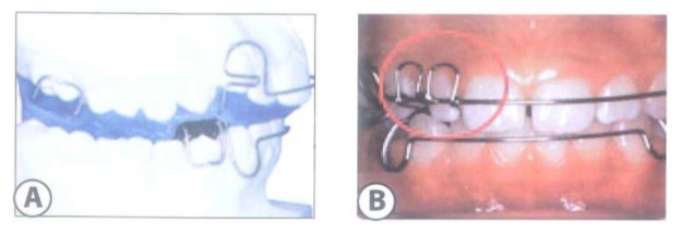 Lò xo Coffin (A) ở khí cụ hàm trên có nâng khớp cắn vùng răng sau và (B) ở khí cụ nguyên tảng.