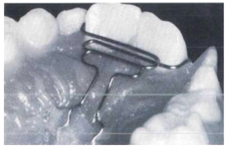 Lò xo hình T: là dạng lò xo đóng dùng đẩy răng cối nhỏ ra ngoài, rất thuận tiện vì dễ gắn trong miệng cũng như dễ tăng lực (Hình 7).