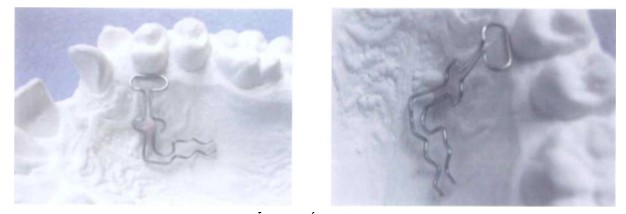 Lò xo mở: dùng đẩy răng ra trước, có chiều ngang bằng độ rộng của răng muốn di chuyển, và 2 đầu lò xo ôm sát mặt bên để ngăn răng di xa trong lúc đẩy ra trước. Đôi khi có thể di răng ra trước và đồng thời di gần hoặc di xa răng (Hình 4).
