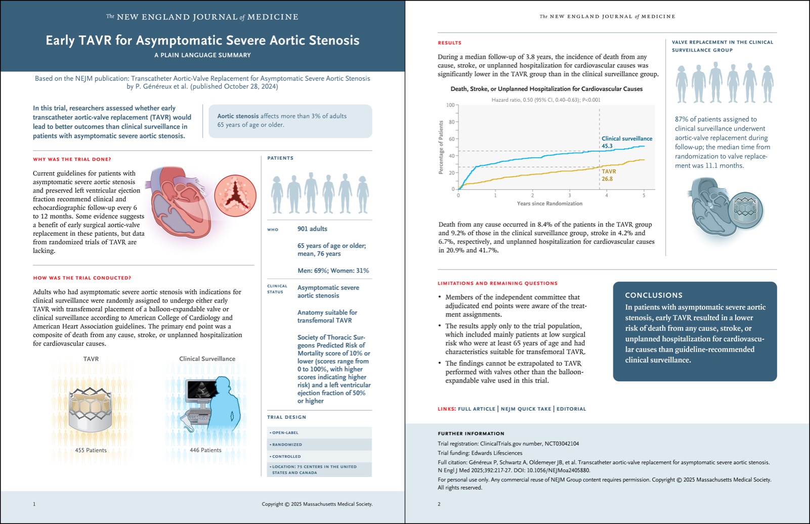 Ở các bệnh nhân bị hẹp van động mạch chủ nặng không triệu chứng, chiến lược TAVR sớm vượt trội hơn so với theo dõi lâm sàng trong việc giảm tỷ lệ tử vong, đột quỵ hoặc nhập viện không dự kiến do nguyên nhân tim mạch
