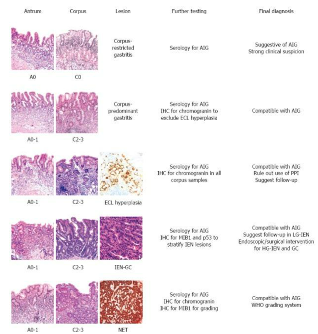 Hình ảnh mô học chẩn đoán bệnh viêm dạ dày tự miễn. Những thay đổi ở antrum và corpus được dàn dựng bằng cách sử dụng hệ thống OLGA. IHC: Hóa mô miễn dịch; ECL: Giống Enterochromaffin; IEN: ung thư nội biểu mô; LG-IEN: IEN cấp thấp; HG-IEN: IEN cấp cao; GC: Ung thư biểu mô dạ dày; OLGA: Liên kết hoạt động để đánh giá viêm dạ dày; AIG: Viêm dạ dày tự miễn dịch; PPI: Thuốc ức chế bơm proton.