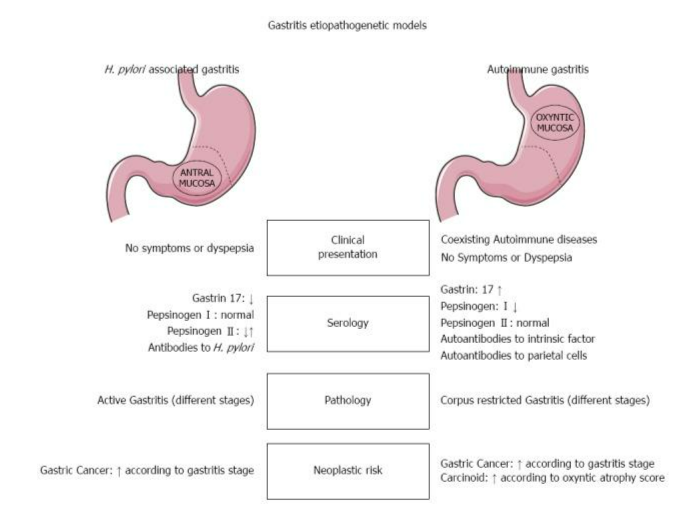 Viêm dạ dày tự miễn liên quan đến Helicobacter pylori. Sự khác biệt chính về biểu hiện lâm sàng, huyết thanh học (cấu hình miễn dịch và chức năng), bệnh lý và nguy cơ ung thư. H. pylori: Helicobacter pylori.