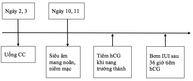 - Bơm tinh trùng vào buồng tử cung 34 – 36 giờ sau mũi tiêm hCG.