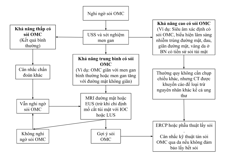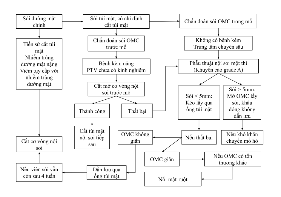 - Sỏi đường mật phát hiện trong mổ cắt túi mật: tuỳ trang thiết bị, kinh nghiệm PTV và nội soi, cam kết phẫu thuật-thủ thuật đã ký trước mổ, tình trạng giải phẫu (sau cắt dạ dày nối Roux-en-Y)… có thể thực hiện: ERCP trong mổ, mở OMC lấy sỏi (nội soi hoặc mổ hở) hoặc ERCP sau mổ. Mổ mở lấy sỏi OMC đơn giản và được áp dụng rộng rãi hơn, nhưng liên quan biến chứng nhiều hơn.