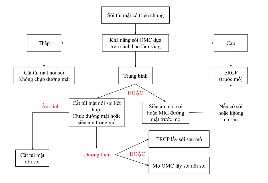 - Nếu sỏi đường mật phát hiện trước hoặc sau khi đã cắt túi mật: ưu tiên lấy sỏi qua ERCP (kỹ thuật không trình bày ở đây).