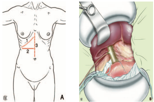 A. Đường mổ. 1. Dưới sườn phải. 2. đường ngang dưới sườn phải. 3. đường giữa trên- dưới rốn.