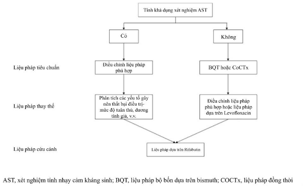Các hướng dẫn hiện hành nhấn mạnh tầm quan trọng của tỷ lệ kháng kháng sinh tại địa phương khi lựa chọn phác đồ điều trị H.pylori phù hợp [4,9,10]. Ở những vùng có tỷ lệ kháng một số loại kháng sinh cao, thành công trong điều trị có thể được cải thiện bằng cách tránh sử dụng những loại kháng sinh đó. Tuy nhiên, dù sự kết hợp kháng sinh mới có thể cải thiện tỷ lệ tiệt trừ, nhưng tình trạng kháng thuốc là không thể tránh khỏi. Chính phủ Đài Loan đã hạn chế việc sử dụng thuốc kháng sinh, hỗ trợ làm giảm tỷ lệ kháng thuốc chính đối với clarithromycin và metronidazole ở H. pylori [18]. Tuy nhiên, tỷ lệ kháng levofloxacin đã tăng từ 4,9% trong năm 2000–2007 lên 13,4% trong năm 2011–2012 [18]. Ngoài ra, việc sử dụng nhiều loại thuốc kháng sinh làm tăng nguy cơ xảy ra biến chứng [4]. Chính vì vậy, kết quả của thử nghiệm tính nhạy cảm kháng khuẩn (AST) đóng vai trò vô cùng quan trọng trong việc đưa ra phác đồ tiệt trừ H. pylori tối ưu. Tuy nhiên, khả năng âm tính giả và khả năng áp dụng trong tất cả các cơ sở y tế là những vấn đề còn tồn đọng [19,20]. Chúng tôi đã xem xét các phác đồ kháng H.pylori quan trọng nhất, giúp khắc phục tình trạng kháng kháng sinh và các chiến lược có thể áp dụng trong thực tế.