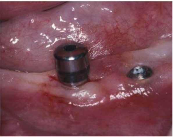 Đường rạch nhỏ qua implant Astra cho phép gắn trụ lành thương. Implant bên phải được bộc lộ vít lành thương.