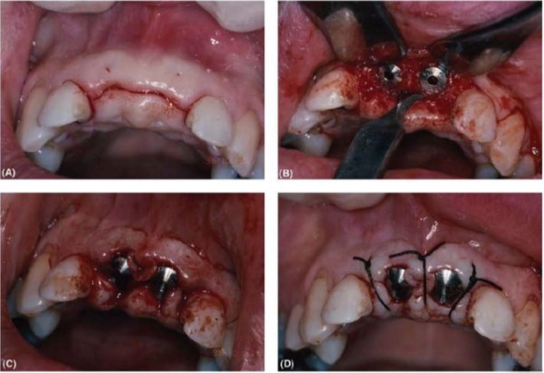 Loạt ảnh lâm sàng minh họa quá trình phẫu thuật đặt abutment. (A) Đường rạch đỉnh sống hàm ngay trên đầu implant kéo dài vào khe nướu răng bên cạnh (B) Bóc tách vạt tốt cho phép lấy bỏ phần xương che phủ vít đậy bằng cây đục cầm tay (C) Vật được điều chỉnh theo trụ lành thương. Mép vạt được tạo hình lại, phần mô thường bị cắt bỏ giờ được giữ lại và ôm xoay quanh trụ lành thương (D) Khâu đóng vạt bằng các mũi khâu rời đơn giản