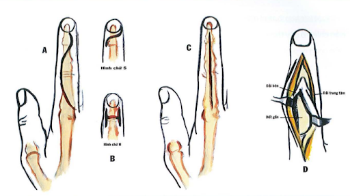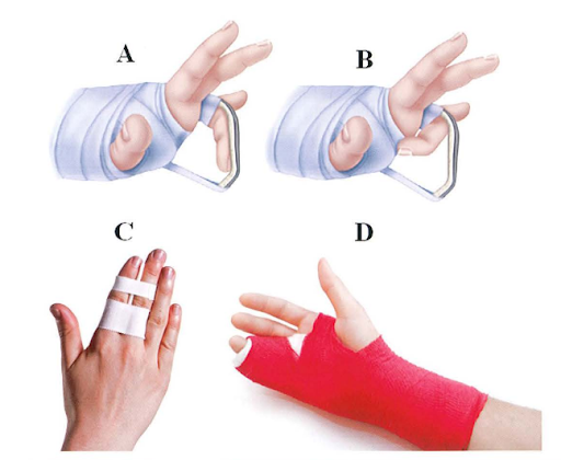 A, B: Nẹp khóa duỗi trong điều trị gãy xương đốt ngón xa, C: Bất động với ngón lân cận, D: Bột tròn trong điểu trị gãy xương đốt bàn