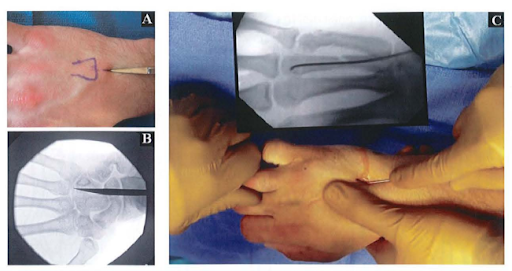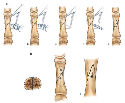 - Yêu cầu: có máy C-arm, đinh Kirschner các cỡ (0,8 – 2 mm), nòng dẫn đinh, bộ vít mini các cỡ thích hợp (thường dùng vít mini đường kính 2,0 mm và 2,7mm), khoan, kẹp săng, bàn để tay, garo (tốt nhất là garo hơi), bàn mổ thấu quang.