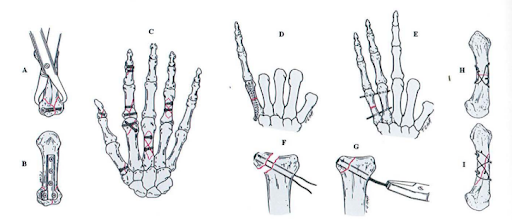 A, B: Nẹp vít mini, C: Vít mini, D: Đinh nội tủy, E: Đinh Kirschner, F, G: Néo ép chỉ thép xuyên xương, H, I: Néo ép bằng chỉ thép và đinh Kirschner
