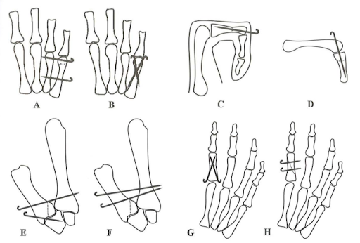 A, B: Gãy cổ xương bàn V, C: Gãy thân xương đốt gần, D: Gãy nền xương đốt gần, E, F: Gãy Bennett, G: Xuyên đinh chéo qua diện gãy, H: Xuyên đinh ngang qua diện gãy