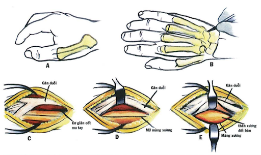 - Đường mổ: có nhiều đường mổ để xử lý các thương tổn xương khớp bàn tay, song hay sử dụng nhất vẫn là đường mổ tiếp cận từ mặt mu tay và với ngón tay có thêm đường mổ mặt bên giữa ngón.