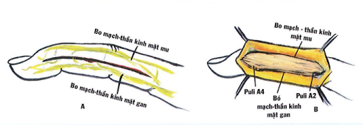 - Điểm vào có thể ở mặt mu hoặc mặt bên nền đốt ngón gần, chú ý tách phẩn mềm, gân duỗi.
