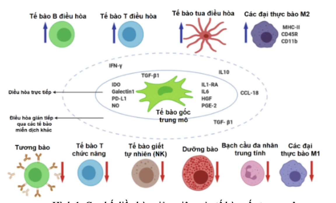 Các tế bào gốc trung mô tiết ra các chất như interleukin-1 (IL-1), IL-6, yếu tố tăng trưởng tế bào gan (HGF), Prostaglandin E2 (PGE2),… để điều hòa trực tiếp, hoặc điều hòa gián tiếp qua các tế bào miễn dịch khác, từ đó hoạt hóa tế bào T điều hòa, tế bào B điều hòa, các đại thực bào M2, cũng như ức chế tế bào T chức năng, tế bào B chức năng, bạch cầu đa nhân trung tính.