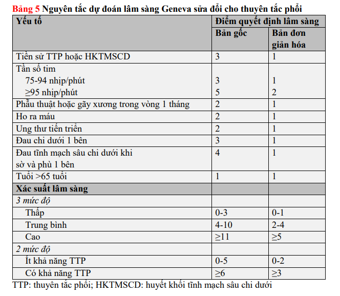 Đánh giá lâm sàng thường bao gồm các cận lâm sàng phổ biến như X-quang ngực và điện tâm đồ để chẩn đoán phân biệt. Tuy nhiên, vì phán đoán lâm sàng thiếu chuẩn hóa, một số thang điểm lâm sàng dự đoán rõ ràng, chi tiết đã được phát triển. Trong số này, các thang điểm dự đoán được sử dụng thường xuyên nhất là thang điểm Geneva cải tiến (Bảng 5) và thang điểm Wells (xem Dữ liệu bổ sung Bảng 1). Cả hai thang điểm dự đoán đã được đơn giản hóa để nỗ lực sử dụng chúng trong thực hành lâm sàng, phiên bản đơn giản hóa cũng đã được xác thực. Bất kể bảng điểm nào được sử dụng, tỷ lệ bệnh nhân được chẩn đoán xác định PE có thể dự kiến khoảng 10% trong phân loại xác suất thấp, 30% trong phân loại xác suất trung bình và 65% trong phân loại xác suất cao. Khi sử dụng cách phân loại hai mức độ, tỷ lệ bệnh nhân được chẩn đoán xác định PE là 12% ở nhóm không có khả năng PE và 30% ở nhóm có khả năng PE. Một nghiên cứu tiến cứu so sánh trực tiếp giữa các thang điểm này đã xác nhận khả năng chẩn đoán tương tự nhau.