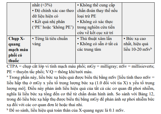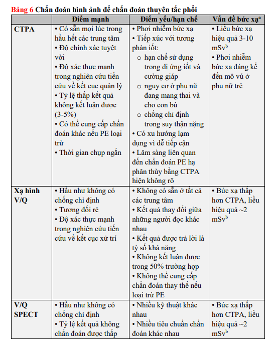 Mặt khác, nó vẫn còn gây tranh cãi rằng liệu bệnh nhân có CTPA âm tính và xác suất lâm sàng cao có cần thêm cận lâm sàng hay không. Tăng áp động mạch phổi do thuyên tắc huyết khối mạn tính (CTEPH) là một di chứng muộn có khả năng gây tử vong của PE, nhưng không nên bỏ sót CTEPH đã tồn tại từ trước ở những bệnh nhân nghi ngờ PE cấp tính. Các dấu hiệu của CTEPH hiện có trên CTPA được liệt kê trong dữ liệu bổ sung Bảng 2; chẩn đoán và quản lý CTEPH được thảo luận trong phần 10. Những điểm mạnh, điểm yếu/hạn chế và vấn đề bức xạ liên quan đến việc sử dụng CTPA trong chẩn đoán PE được tóm tắt trong Bảng 6