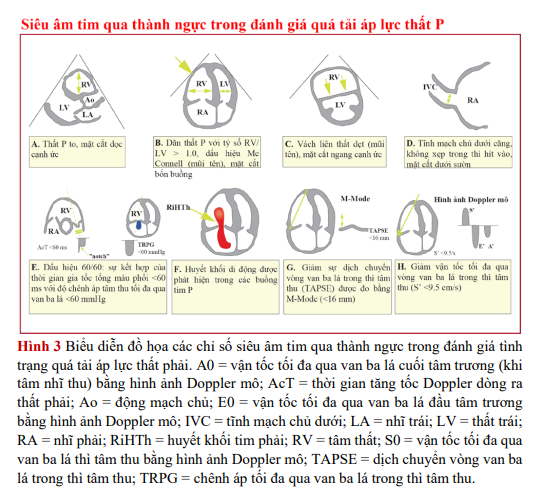 PE cấp tính có thể dẫn đến quá tải áp lực và rối loạn chức năng RV, mà có thể được phát hiện bằng siêu âm tim. Do hình học đặc thù của RV, không có thông số siêu âm tim riêng lẻ nào có thể cung cấp thông tin nhanh chóng và đáng tin cậy về kích thước hoặc chức năng RV. Đây là lý do tại sao tiêu chuẩn siêu âm tim để chẩn đoán PE lại khác nhau giữa các nghiên cứu. Vì giá trị tiên đoán âm là 40-50%, nên kết quả âm tính không thể loại trừ PE. Mặt khác, các dấu hiệu của quá tải hoặc rối loạn chức năng RV cũng có thể được tìm thấy khi không có PE cấp tính, mà có thể là do bệnh tim hoặc bệnh hô hấp đi kèm. Kết quả siêu âm tim của quá tải và/hoặc rối loạn chức năng RV được trình bày bằng hình ảnh trong Hình 3. Thất phải giãn được tìm thấy trong ≥25% bệnh nhân có PE trên siêu âm tim qua thành ngực (TTE) và rất hữu ích trong phân tầng nguy cơ của bệnh.