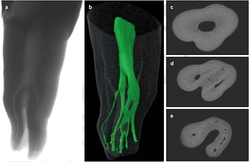 (a) Phim X quang của một răng cối nhỏ hàm dưới đã nhổ có hai chân. (b) Tái tạo hình ảnh micro-CT cho thấy hệ thống ống tủy phức tạp màu xanh lá. (c) Hình ảnh micro-CT cắt theo mặt phẳng axial, ở một phần ba thân răng. Chỉ thấy một ống tủy duy nhất. (d) Micro-CT cắt theo mặt phẳng axial, ở một phần ba giữa. Quan sát thấy nhiều ống tủy. (e) Micro-CT cắt theo mặt phẳng axial, một phần ba chóp. Quan sát thấy dạng giải phẫu hình chữ C với nhiều ống tủy riêng biệt.
