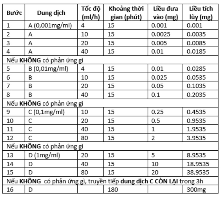 - Sau hội chẩn giữa chuyên khoa ung bướu, dị ứng miễn dịch và dược lâm sàng, người bệnh được chuyển phác đồ từ cisplatin sang carboplatin (Hoạt chất cùng nhóm platinum) đồng thời làm test da với carboplatin ở chu kỳ 4: Test lẩy da âm tính; test trong da dương tính với carboplatin nồng độ 1:10 và 1:1. Người bệnh được giảm mẫn cảm theo phác đồ 16 bước trong 7 giờ theo dõi liên tục, được mô tả chi tiết theo bảng dưới đây: