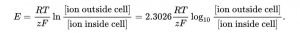 E: Điện thế màng F: Hằng số Faraday = 9.648 533 99(24)×104 C mol−1 R: Hằng số khí lý tưởng T: Nhiệt độ Kelvin Z: Số mol ion được chuyển qua màng