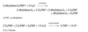- Cường độ màu đậm nhạt của p‑nitrophenol tạo thành tỷ lệ thuận với hoạt độ α‑amylase. Chất này được xác định bằng cách đo sự gia tăng của độ hấp thu.