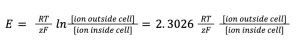 E: điện thế màng F: hằng sô Faraday = 9.648 533 99(24)x 104 C mol-1 R: hằng số khí lý tưởng T: nhiệt độ Kelvin z: số mol ion được chuyển qua màng