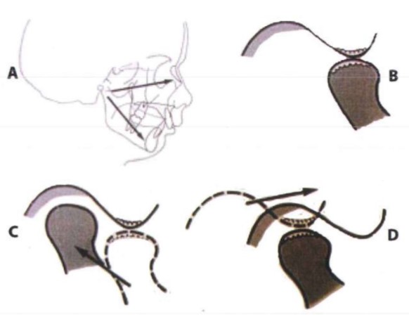 A: Các vector tăng trưởng phân kỳ di chuyển các nền xương hàm về trước. B: Tác động của khí cụ activator lên khớp thái dương – hàm: di chuyển lồi cầu ra trước và xuống dưới. C: Đáp ứng ở vị trí mới nhờ sự tăng trưởng của lồi cầu. D: Đáp ứng ở vị trí mới nhờ sự tái tạo hình dáng của hõm khớp.