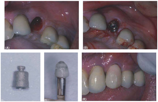 (A) Nhổ răng ít sang chấn (B) Đặt implant và một abutment tiêu chuẩn (C) Dùng một trụ tạm bằng kim loại khít sát với abutment tiêu chuẩn (D) Mão tạm được đắp bằng composite ngay trong giai đoạn này (E) Mão tạm khi lắp trên miệng. Mão vĩnh viễn có thể được làm ở giai đoạn sau. Nhìn chung, những nhược điểm và sự phức tạp của phương pháp này làm nó chỉ đáng được cân nhắc trong một số trường hợp đặc biệt. Do implant vẫn chưa được tích hợp xương khi vừa mới đặt, nên nếu ta lấy dấu ở giai đoạn này cần phải cẩn thận không để ảnh hưởng đến vị trí và độ vững ổn của implant.