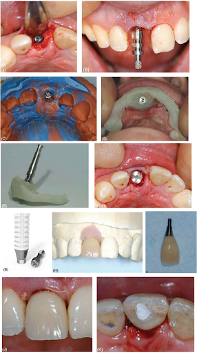 (A) Trên vùng mất răng đã lành thương, đặt một implant Astra ST (B) Gắn coping (C) Lấy dấu, coping được giữ lại trong dấu (D) Trong một case phục hình tức thì tương tự, jig làm sẵn bằng nhựa acrylic để giữ coping (E) Gắn bản sao trên labo vào coping và đưa ngược trở lại mẫu hàm (F) Gắn mão tạm vào implant và khâu đóng (G) Một trụ tạm tương ứng với implant Astra, nền bằng titanium và trụ nhựa acrylic (H) Mão tạm trên mẫu hàm (I) Mão tạm một khối lưu giữ bằng vít (J) Có thể làm và gắn mão tạm trong vòng vài giờ (K) Mão tạm được chỉnh khớp sao cho không chịu lực nhai trên bất kỳ hướng nào.