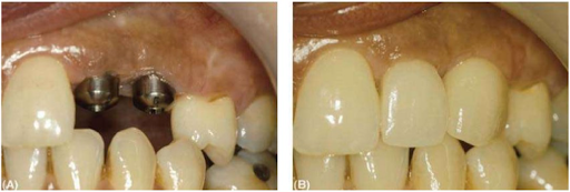 (A) Trường hợp mất răng cửa bên và răng nanh. Rất dễ thấy các viền nướu, đặc biệt là giữa hai implant (B) Phục hình có thẩm mỹ chấp nhận được bằng cách làm các mão răng có điểm tiếp xúc dài và làm dày phần kẽ răng.
