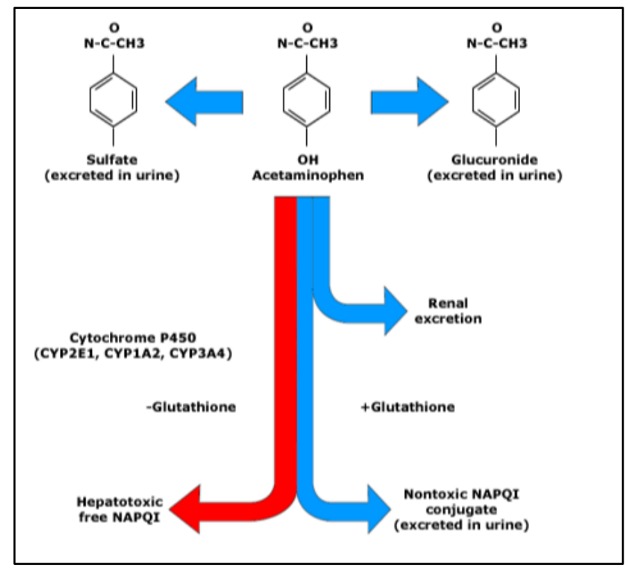 - Khi quá liều (Con đường màu đỏ), lượng paracetamol được chuyển hóa bởi enzym cytochrom P450 thành NAPQI tăng lên.