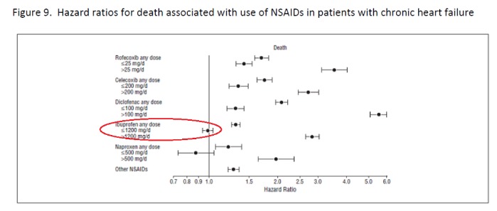 - Gov.uk 2015: High dose ibuprofen (22400mg/day): Small increase in cardiovascular risk