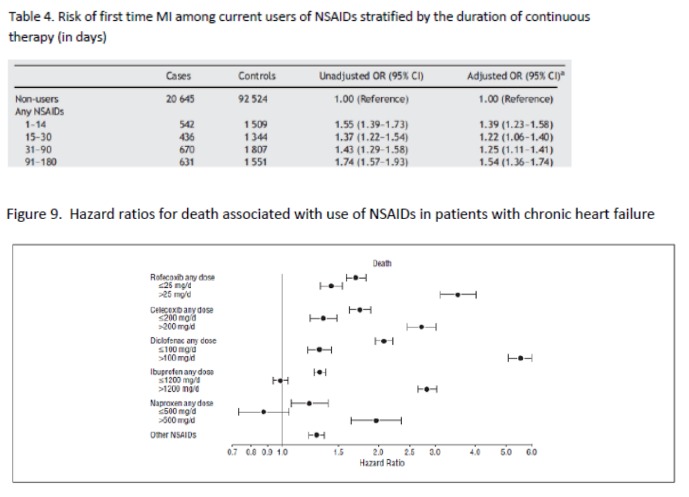 Các NSAIDs khác ngoài Naproxen: nguy cơ tim mạch được phát hiện không chỉ trên nhóm ức chế chọn lọc COX 2 mà còn cả ở các NSAIDs không chọn lọc. Nguy cơ tim mạch của Diclofenac tương đương với Rofecoxib, thuốc đã bị rút ra khỏi thị trường do nguy cơ tim mạch. Ibuprofen liều thấp (<1200mg/ngày) có nguy cơ tim mạch thấp.