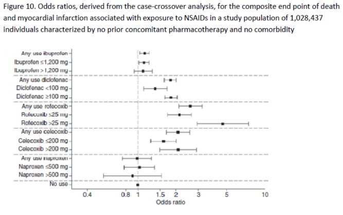 Nghiên cứu mới nhất năm 2011 của McGettigan và Henry cho thấy nguy cơ tim mạch cao nhất là rofecoxib (RR 1,45, CI95 1,33-1,58) và diclofenac (RR 1,40, CI95 1,27 – 1,55), và thấp nhất là naproxen (RR 1,09, CI 1,02 – 1,16)