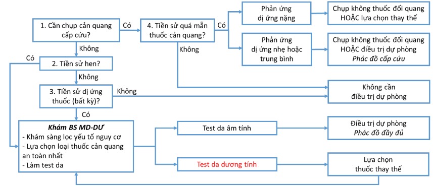 - Dựa trên các khuyến cáo của Hội Điện quang Hoa Kỳ (American College of Radiology), bệnh viện đã xây dựng lưu đồ xử trí khi có người bệnh dùng TCQ-iod nhằm tối ưu hóa hiệu quả, giảm chi phí điều trị và tránh lạm dụng thuốc. Bác sĩ điều trị sẽ là người quyết định các vấn đề liên quan đến phác đồ dự phòng của người bệnh.
