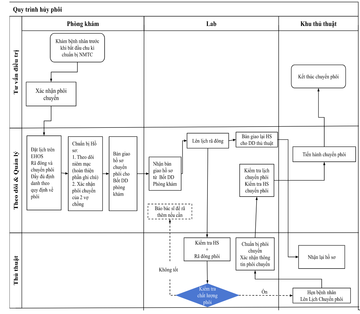 | Time-out trước chuyển phôi | Bác sĩ lâm sàng Bác sĩ Lab/Chuyên viên Lab Điều dưỡng khu thủ thuật | Đảm bảo chuyển đúng phôi đã chọn cho đúng bệnh nhân |