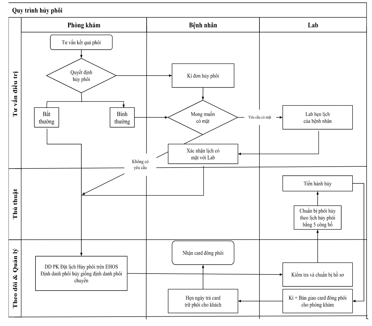 | 5 | Hủy phôi | Vào ngày hủy phôi, tiến hành hủy phôi theo quy trình, thực hiện doublecheck ở tất cả các bước. | 2 Nhân viên lab cùng thực hiện | |