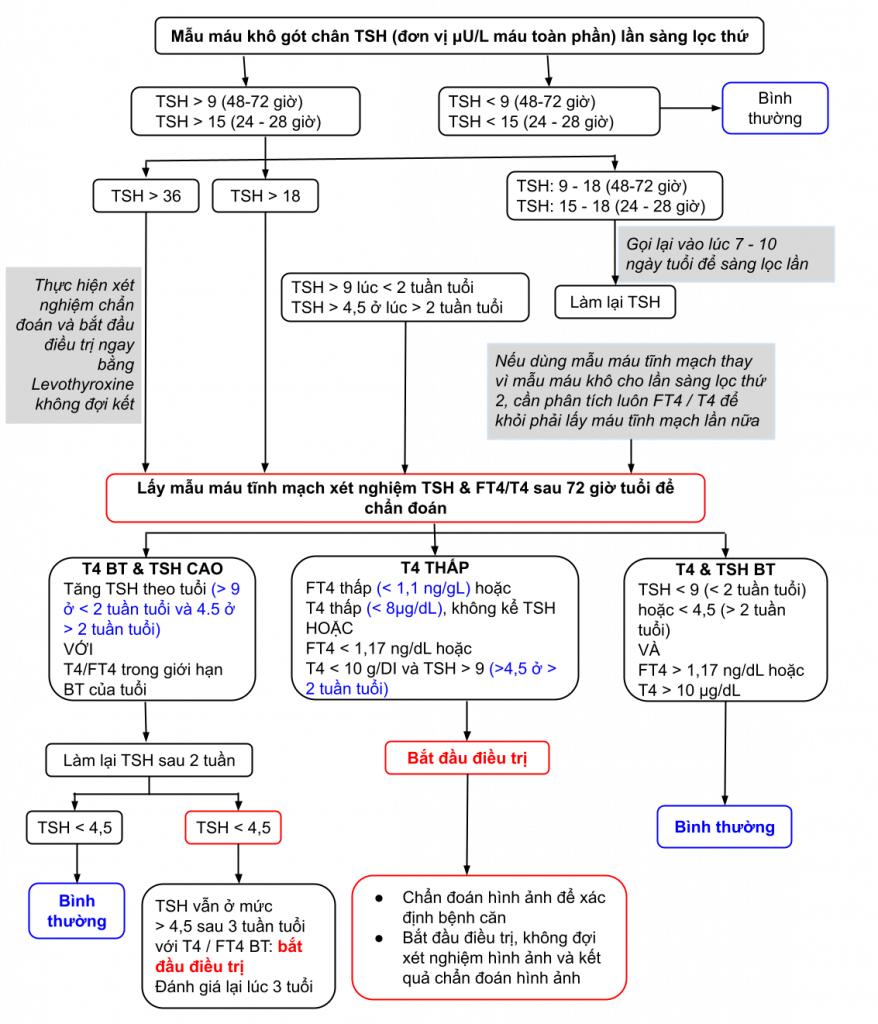 *: Tư vấn chuyên gia nội tiết nhi để loại trừ trường hợp thiếu TBG (Thyroid binding globulin) Đổi đơn vị mIU/L huyết thanh sang đơn vị mIU/L máu toàn phần bằng cách chia cho 2,22
