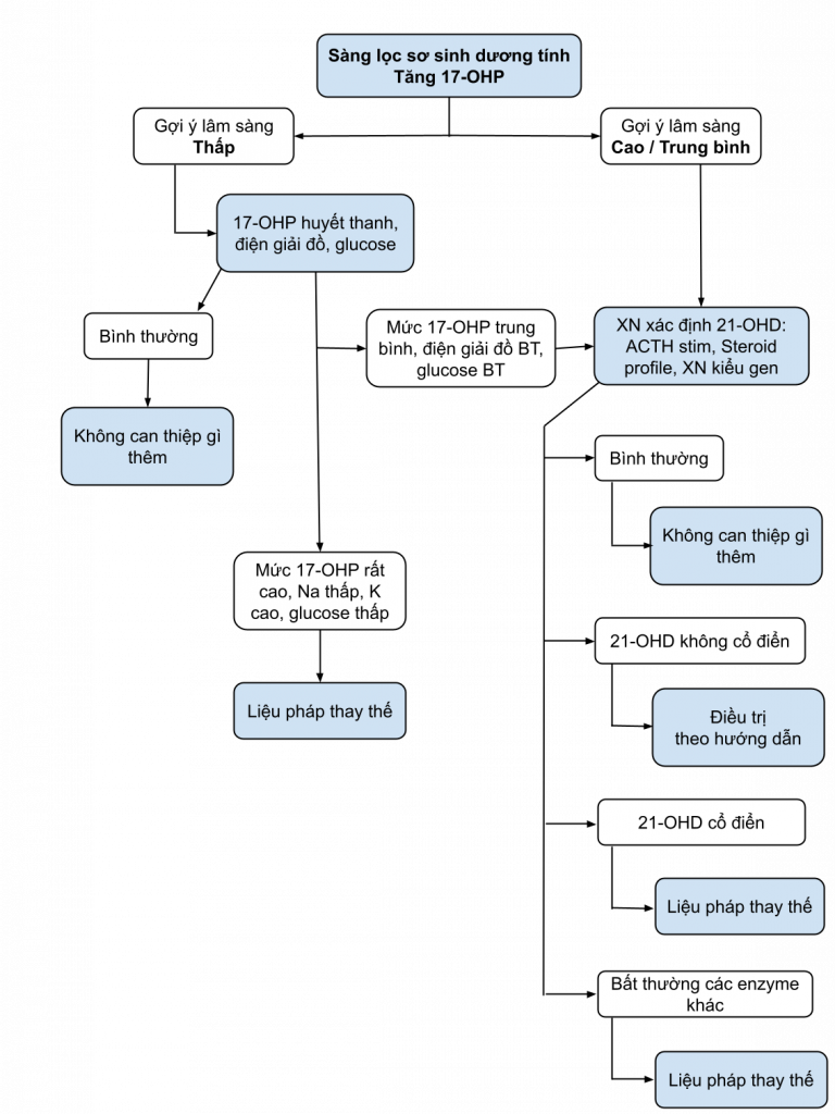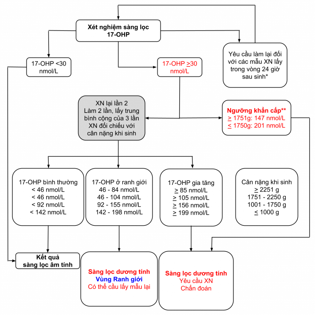 (*) Nếu mẫu được lấy trong 24 giờ đầu sau sinh sẽ được yêu cầu làm lại (Mặc dù mẫu thứ nhất vẫn được phân tích). (**) Các nồng độ 17-OHP sẽ được hội chẩn khẩn cấp trước khi sàng lọc lại để xác nhận.