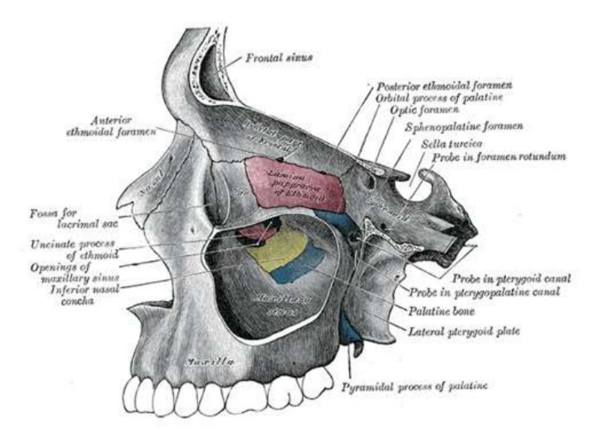 Xoang hàm là xoang lớn nhất trong các xoang cạnh mũi, với thể tích từ 15 – 30ml. Xoang hàm nằm trong xương hàm trên, có hình nón tháp với đỉnh là mỏm gò má của xương hàm trên và đáy là thành trong xoang hàm. Các thành còn lại gồm: thành trên, thành dưới, thành sau và thành trước