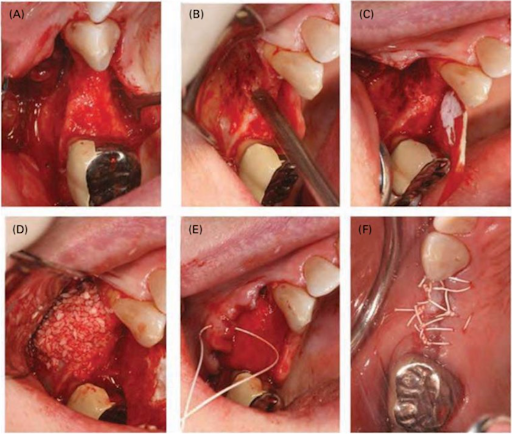 Thực hiện GBR sau khi lật vạt toàn bộ (A), khoan xương vỏ của xương bên dưới (B), tiếp theo là đặt màng (C) và xương ghép hạt đồng loại (D). Vạt được kéo lại và khâu để đóng kín vị trí phẫu thuật (E, F). Rạch giữa mào xương tại vị trí #15 và #14, mở rộng sang răng kế cận giống như đường rạch khe nướu. Khoan xương vỏ của xương bên dưới bằng mũi khoan tròn nhỏ để tế bào từ xương dễ dàng đi vào vùng ghép trong quá trình lành thương. Xương ghép hạt đồng loại được hòa tan bão hòa trong nước cất khử ion rồi cho vào thiếu hồng. Màng được lèn vào bên dưới vạt phía ngoài và phía trong để che phủ toàn bộ xương ghép hạt.